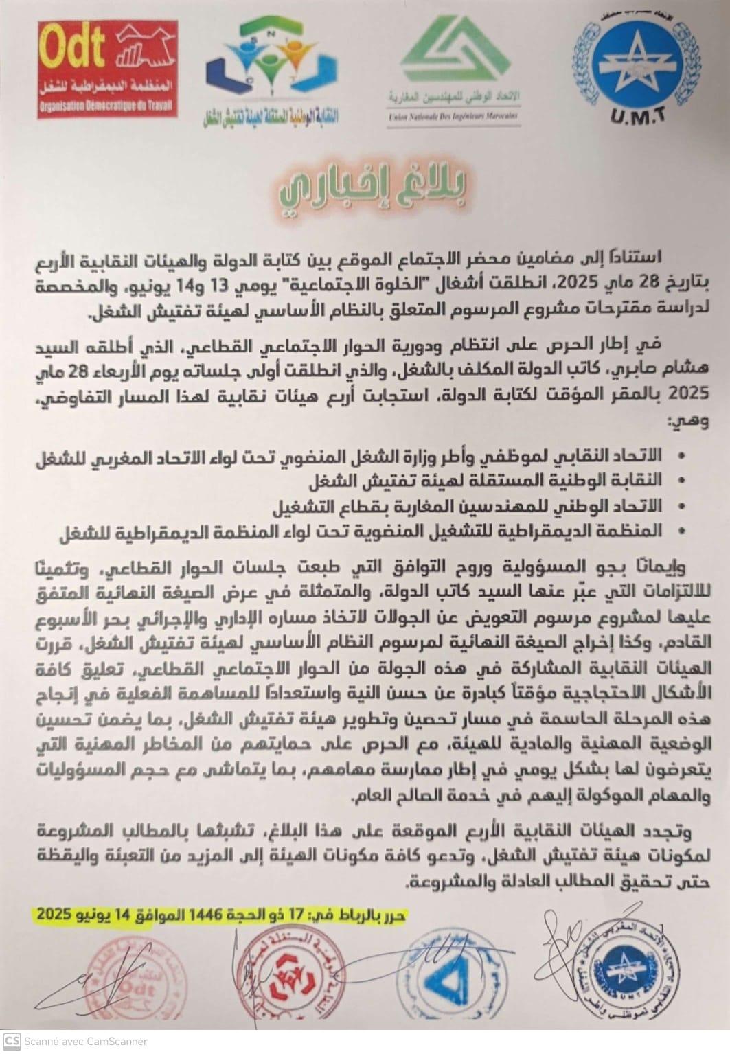 ودعت النقابات إلى استمرار التعبئة واليقظة داخل صفوف الهيئة، تحسبًا لأي تراجع محتمل عن الالتزامات الحكومية، معتبرة أن إنجاح هذه المرحلة الحاسمة يتطلب تضافر الجهود، واستحضار المصلحة العليا لخدمة الصالح العام، واحترام مكانة الهيئة كأحد الأعمدة الأساسية في تنظيم سوق الشغل ومراقبة احترام تشريعات العمل