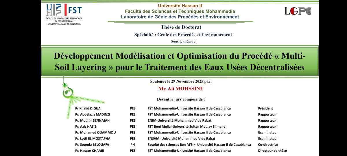 شهدت كلية العلوم والتقنيات بمدينة المحمدية، صباح اليوم السبت 28 نونبر 2025، حدثًا علميًا مميزًا تمثّل في مناقشة الطالب الباحث محسن علي الطالب لأطروحة الدكتوراه في موضوع يعدّ من أهم المواضيع البيئية المرتبطة بحماية الموارد المائية واستدامتها.