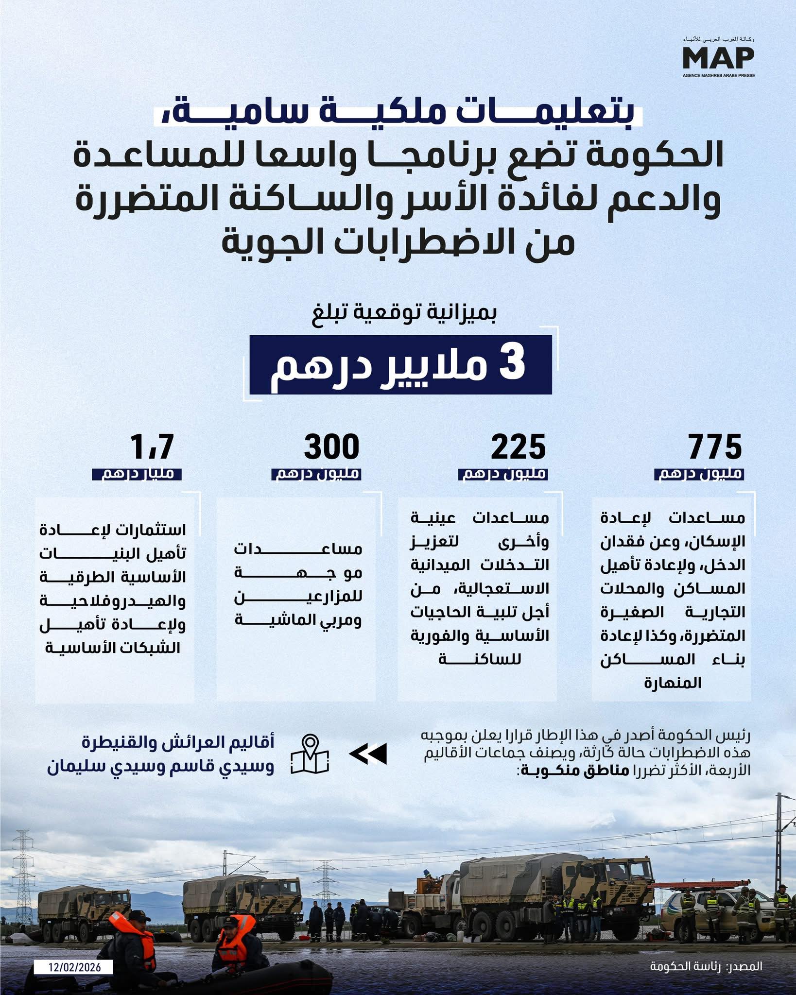 ■الرباط 12 فبراير 2026 (ومع)//_على إثر الاضطرابات الجوية الاستثنائية التي شهدتها المملكة خلال الشهرين الماضيين، وخاصة في سهل الغرب واللوكوس، أعطى صاحب الجلالة الملك محمد السادس، نصره الله، انطلاقا من العناية الموصولة التي يحيط بها جلالته رعاياه وحرصه على سلامتهم وتحسين أحوالهم المعيشية، تعليماته السامية إلى الحكومة من أجل وضع برنامج واسع النطاق للمساعدة والدعم لفائدة الأسر والساكنة المتضررة، واتخاذ الإجراءات التنظيمية اللازمة في مثل هذه الظروف.