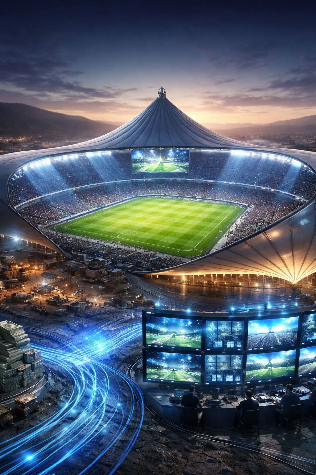 كما يتضمن المشروع تجهيز الملعب بأنظمة عرض رقمية متطورة، تشمل شاشات عملاقة وشاشات LED محيطية، إلى جانب بنية تحتية متكاملة للبث الإذاعي والتلفزيوني عبر شبكة ألياف بصرية، بما ينسجم مع متطلبات النواقل الدولية وحقوق البث الحديثة.