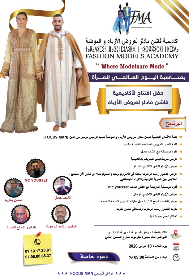 تستعد مدينة أكادير لاحتضان حدث فني وثقافي مميز بمناسبة اليوم العالمي للمرأة، يتمثل في حفل افتتاح أكاديمية “فاشن مادلز” لعروض الأزياء والموضة (Fashion Models Academy)، وذلك يوم الثلاثاء 10 مارس 2026 ابتداءً من الساعة التاسعة ليلاً بقاعة العروض التابعة للمديرية الجهوية للشباب والتواصل بشارع الحسن الثاني بمدينة أكادير.