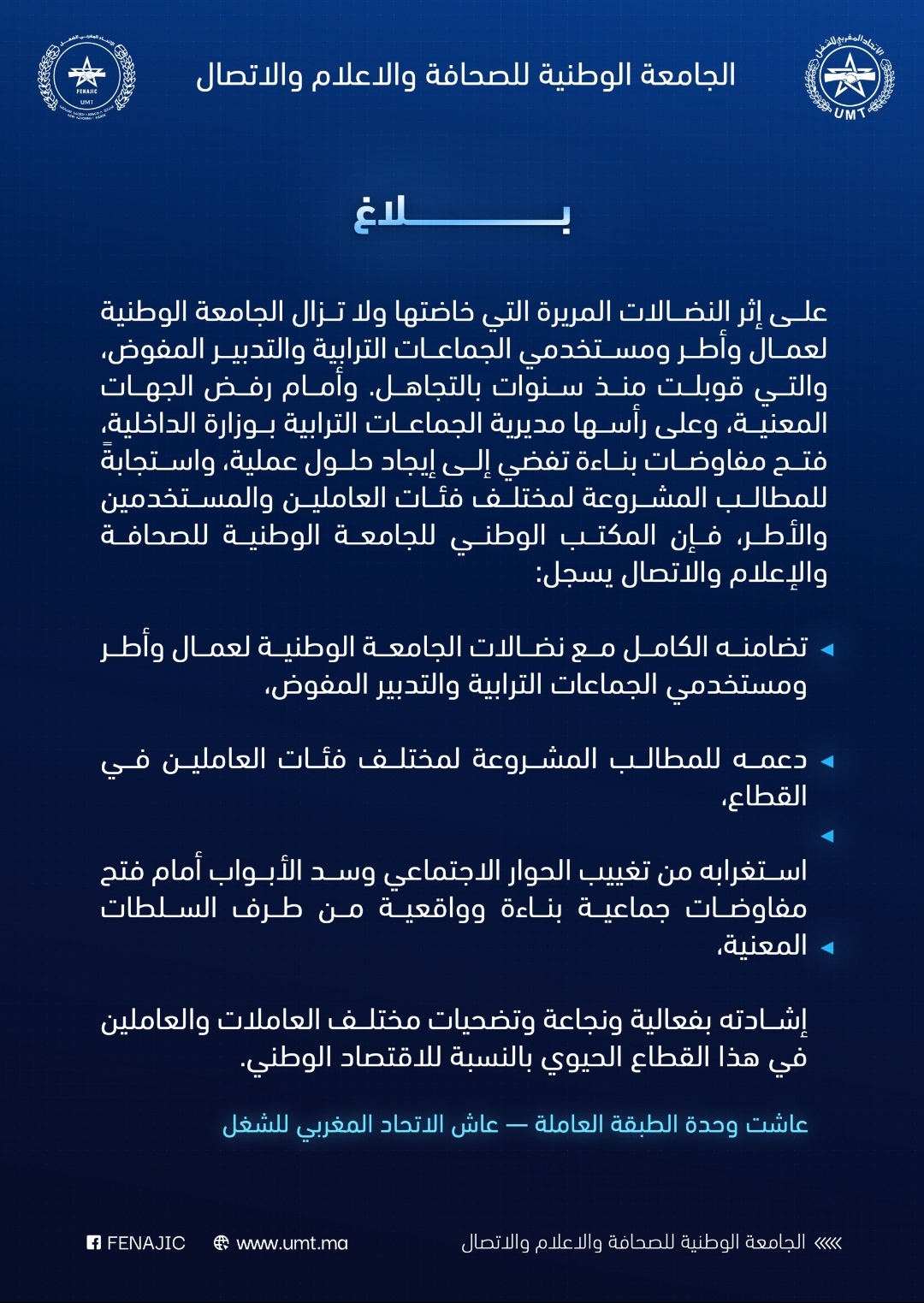 وجاء ذلك في بلاغ رسمي، أكدت فيه الجامعة أن شغيلة الجماعات الترابية ما تزال تخوض منذ سنوات نضالات مطلبية متواصلة، في ظل استمرار تجاهل عدد من الملفات الاجتماعية والمهنية العالقة، وعدم إيجاد حلول عملية تستجيب لانتظارات العاملات والعمال والأطر.